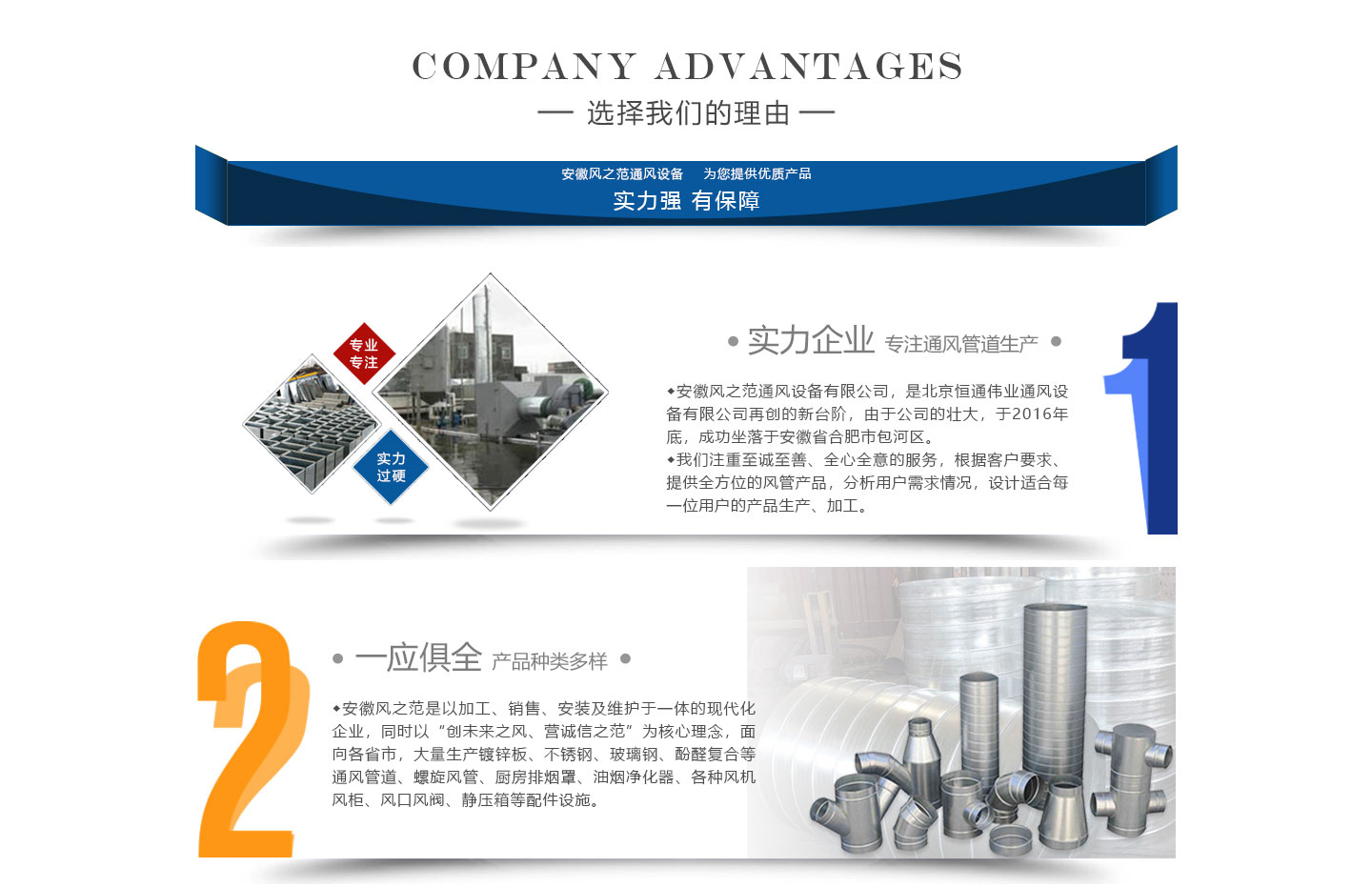 安徽風(fēng)之范通風(fēng)設(shè)備有限公司,是北京恒通偉業(yè)通風(fēng)設(shè)備有限公司再創(chuàng)的新臺(tái)階,多年來,公司員工憑著“誠(chéng)信敬業(yè)、團(tuán)結(jié)拼搏、勇于開拓、務(wù)實(shí)進(jìn)取”的企業(yè)精神,先后承接了多項(xiàng)重點(diǎn)工程項(xiàng)目,使公司健康穩(wěn)步發(fā)展?,F(xiàn)由于公司的壯大,業(yè)務(wù)的拓展,又于2016年底,成功坐落于安徽省合肥市包河區(qū)。本公司生產(chǎn)設(shè)備精良,技術(shù)力量雄厚,質(zhì)保體系完善!讓用戶體驗(yàn)到,貼心的服務(wù),無憂的售后!風(fēng)之范是以加工、銷售、安裝及維護(hù)于一體的現(xiàn)代化企業(yè),同時(shí)以“創(chuàng)未來之風(fēng)、營(yíng)誠(chéng)信之范”為核心理念,面向全國(guó)各省市,大量生產(chǎn)鍍鋅板、不銹鋼、玻璃鋼、酚醛復(fù)合等通風(fēng)管道、螺旋風(fēng)管、廚房排煙罩、油煙凈化器、各種風(fēng)機(jī)風(fēng)柜、風(fēng)口風(fēng)閥、靜壓箱等配件設(shè)施。廣泛承接商場(chǎng)、工廠、酒店、寫字樓、地下室等,消防排煙工程、除塵凈化工程、室內(nèi)通風(fēng)工程、暖通空調(diào)工程、廚房排煙凈化工程。我們力求上進(jìn),追求,歡迎各界人士技術(shù)指導(dǎo),經(jīng)濟(jì)合作,共創(chuàng)美好明天!